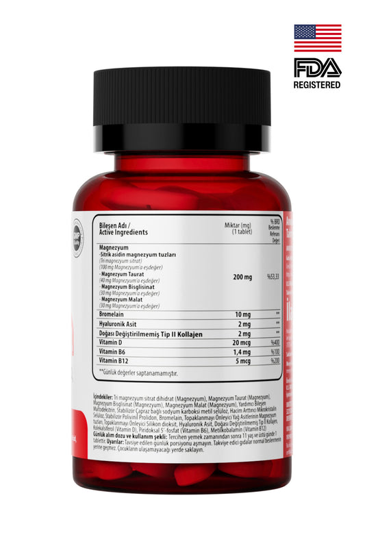أناوسين مغنيسيوم X4 كومبلكس: سيترات، تورات، بيسجليسينات، مالات، بروميلين، كولاجين، حمض الهيالورونيك، فيتامين D و B12 و B6