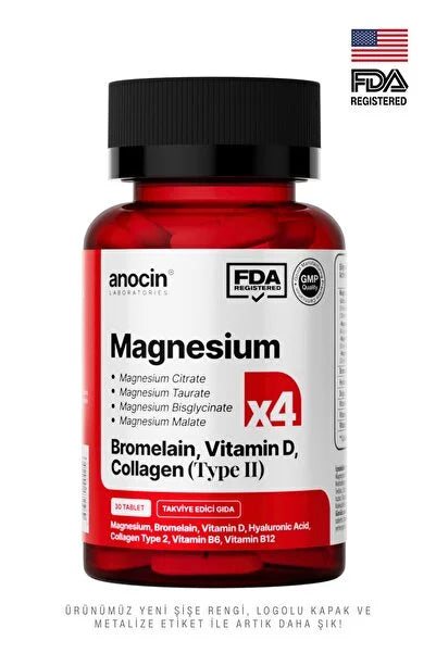أناوسين مغنيسيوم X4 كومبلكس: سيترات، تورات، بيسجليسينات، مالات، بروميلين، كولاجين، حمض الهيالورونيك، فيتامين D و B12 و B6